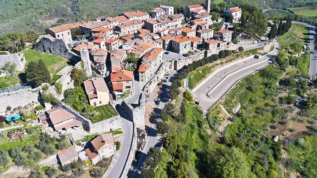 Quando scendi da Corsignano riprendi la 102; il percorso taglia per Ponte A Bozzone ed è da qui che cominciano le curve tra campagne e fasce di alberi. Continua a salire su Via della Certosa con le indicazioni fino a San Gusmé, borgo medievale e perla del Chianti. Uscito da San Gusmé, vai verso nord su Via degli Etruschi SP73/a con a destra l’area archeologica di Pian Tondo. Ti servirà la SP16 a destra, ma poco prima di salire a Mercatale Valdarno guarda a est verso la Torre di Galatrona. Da Mercatale il percorso si fa più liscio; imbocca la SP18 tramite Via le Campore fino a Capannole e prosegui in prossimità di Civitella in Val di Chiana, coi tornanti in salita. L’ascesa è veramente suggestiva.