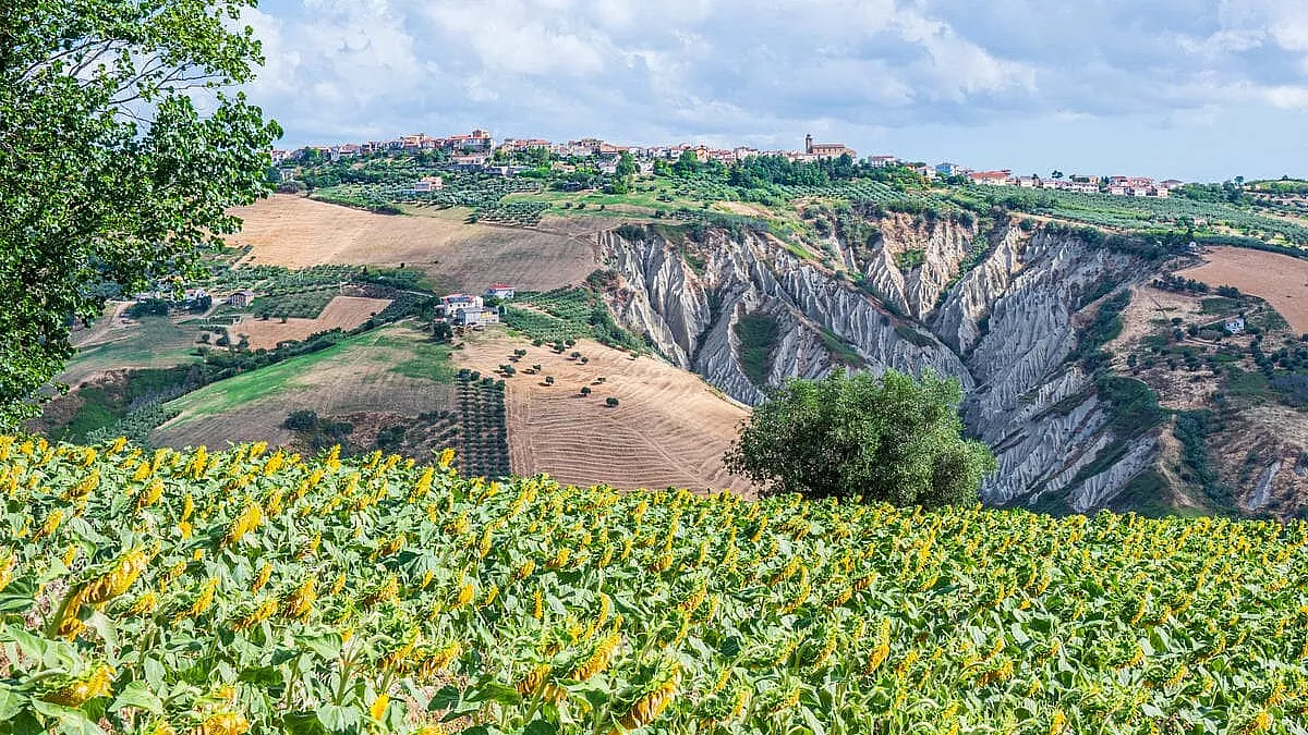 Il soprannome che abbiamo scelto per raccontare quest’angolo di Abruzzo non è casuale. Se conoscete la celebre D81 in Corsica, la strada dei Calanchi di Piana, probabilmente vi sentirete “a casa” anche nel comune teramano di Atri. C’è un’ovvia differenza cromatica: le rocce corse sono prevalentemente rossastre, qui emerge una cromia più tendente al grigio. Una bellezza primordiale che viene protetta, sin dal 1995, dalla Riserva Naturale Regionale dei Calanchi di Atri. Ma cosa sarebbero questi calanchi? Sostanzialmente, sono dei solchi alti e profondi nel terreno argilloso, disegnati dall’acqua e dal vento come agenti erosivi, che hanno disegnato un paesaggio decisamente originale. Li si raggiunge in moto, ovviamente, ma il consiglio è quello di scoprirli a piedi, percorrendo i sentieri – lunghi alcuni chilometri – che portano verso la Cappella di San Paolo o il Belvedere dei Calanchi. Quest’ultimo è un punto straordinariamente panoramico, dal quale lo sguardo spazia dall’Adriatico alla Majella, fino al Gran Sasso. E, ovviamente, arriva a uno dei borghi più belli dell’Abruzzo, che andiamo a scoprire subito.