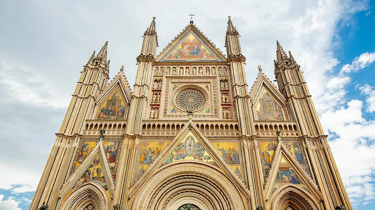 Esempio di eleganza dell’architettura gotica in Italia, il Duomo di Orvieto (anche noto come Cattedrale di Santa Maria Assunta in Cielo) si introduce con una facciata decorata da mosaici colorati e intricati rilievi. Parimenti interessante è l’interno, che ospita cicli di affreschi di grande impatto scenico, come la Cappella di San Brizio del Signorelli. Il complesso richiese complessivamente tre secoli di lavori e la facciata, così bella e visibile anche da lontano, venne progettata da Lorenzo Maitani.