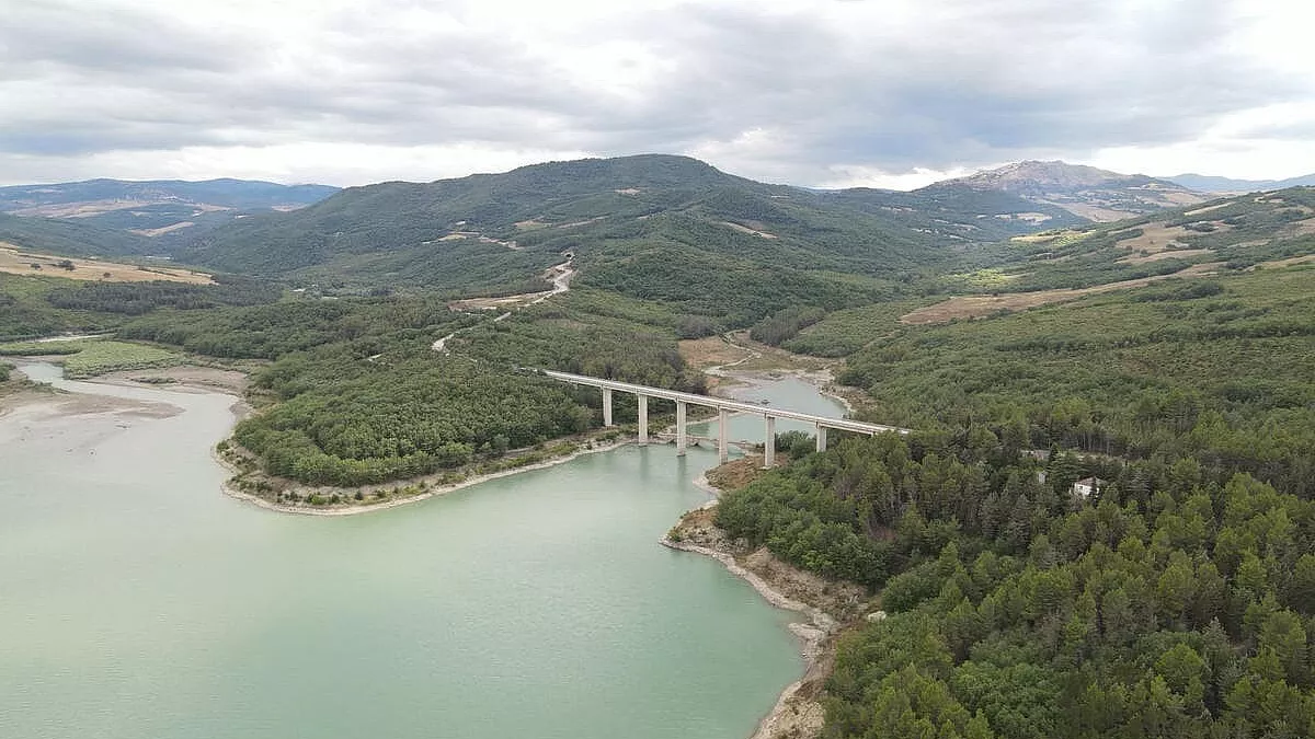 Prima tappa, il Lago di Pietra del Pertusillo. Si imbocca la Strada Provinciale 16, tra curve morbide, a tratti strette e chiuse, a tratti larghe. Lungo il percorso si incontrano Calvello, piccolo centro conosciuto per la produzione di ceramica artistica, e Viggiano, noto per la lunga tradizione legata alla musica popolare e, in particolare, alla costruzione di arpe.