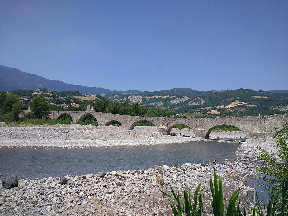 Il ponte romano sul fiume Trebbia è affascinante, poi con quell’acqua fresca che scorre sotto è un’attrazione fatale. Trovo un piccolo pezzetto di spiaggia e via giacca, stivali, pantaloni e… ‘splash’ in acqua. Non ho con me il ricambio, è rimasto tutto sulla moto a 100 passi sotto il sole. Fa niente, via l’intimo e su i pantaloni, stivali e giacca pronto a ripartire. Non è questa la mia destinazione oggi.