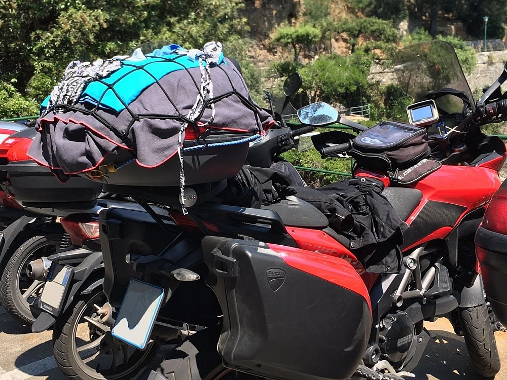 È ancora mattina presto, ma le temperature hanno già superato i 30 gradi. Portofino, caletta di spiaggia libera, via la giacca, via i pantaloni, e… togli le mutande, metti costume e ‘splash’, un tuffo nell’acqua fresca e cristallina. Togli il costume, metti le mutande e stendi tutto sulle borse della moto.