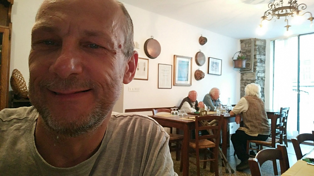 Raggiunto Riomaggiore, ultima o prima delle Cinque terre, c’è solo il tempo per un drink e poi verso i monti sperando in un po’ di refrigerio con l’arrivo della sera, direzione passo della Cisa. Arrivato quasi alla vetta, stremato, attraverso il borgo di Montelungo Terme. Terme? Terme=acqua. Osteria=mangiare. Chiedo subito all’oste: “dove sono le terme? Fino a che ora si può cenare? Risposta: “è 20 anni che dicono che le faranno, ma ancora non c’è niente”. Pazienza, la cena è stata ottima con la pittoresca compagnia degli anziani del luogo e l’alloggio nel B&B vicino gradevolissimo.