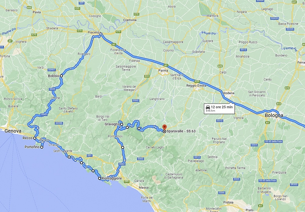 Oggi la strada passa tutta sulla costa ligure fino alle Cinque Terre. A Trigoso, subito passato Sestri Levante, svolto a destra per continuare a costeggiare il mare (SP370). È una strada da provare tra claustrofobiche strette gallerie e ampi scorci panoramici sul mare.