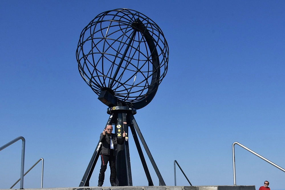 Mi complimento con me stesso, sono veramente felice della meta raggiunta. Con calma mi sistemo, sfilo i guanti, slaccio il casco, sgancio la borsa serbatoio, prendo dal bauletto la reflex e cammino verso il mappamondo (un poco appesantito ed impacciato dal casco, dalla borsa e dalla reflex!). Con un messaggio avviso la famiglia e gli amici motociclisti di essere arrivato a Capo Nord e da mia figlia vengo immediatamente identificato dalle immagini della webcam, sia all’arrivo nel parcheggio sia mentre mi avvio a piedi verso il mappamondo! Tutta la zona è oggi molto affollata, tantissimi camper, tante auto e tante moto. Silenziosamente, emozionato e contento, raggiungo il mappamondo. Entro nel centro visitatori, anch’esso molto affollato, mi concedo un caffè ed acquisto i piccoli souvenir per me e per regali agli amici. Ritorno ad Honningsvåg e raggiungo l’hotel (già prenotato nel pomeriggio); sistemo i bagagli in camera e ceno direttamente nel ristorante. Lo chef prepara delle pietanze tipiche norvegesi con innesti di cucina orientale. Gusto, comunque, questa particolare cucina con sapori misti, base norvegese con condimenti, salse e spezie orientali. A tavola converso con la giovane ragazza (portoghese!!) che si occupa del servizio ai tavoli.