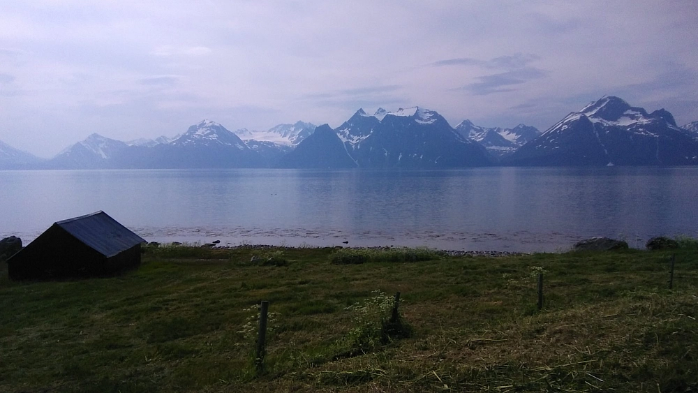 Le montagne circondano le profonde e larghe insenature, specchiandovisi e creando quei riflessi stupendi che solo qui sono possibili. Continuo a viaggiare, fermandomi spesso per riprendere foto o solo per una sosta di riposo. Nei pressi del bivio che porta a Tromsø, il clima muta repentinamente e nuvoloni di pioggia si alzano nel cielo coprendo le montagne. Inizia a piovere e velocemente indosso la tuta anti acqua mentre la pioggia si intensifica, ovviamente rallentando la mia andatura. Avevo preventivato di viaggiare ancora per almeno un’altra ora ma, visto il peggioramento del meteo, decido di fermarmi appena possibile.