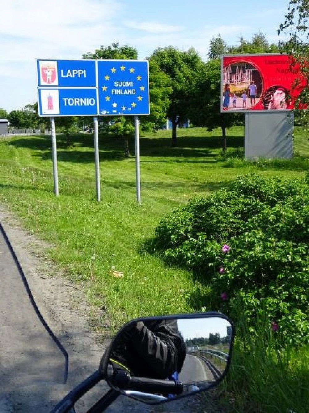 In alcuni tratti, la strada è stata allargata ma, superata la cittadina di Kalix e sino al confine con la Finlandia, è ancora ad unica carreggiata e si attraversa la continua foresta con i laghi che si intravedono di continuo e, a tratti, divengono parte fondamentale del paesaggio. Vado, proseguo, fermandomi quando ne avverto l’esigenza. Il clima continua ad essere insolitamente caldo, considerando le latitudini che attraverso. Mi fermo ad Haparanda, ultimo paese svedese prima del confine con la Finlandia, faccio il pieno e mangio una ciambella sorseggiando un caffè. Omaggio di un caffè anche un simpatico svedese che mi ha fornito un innaffiatoio per poter sciacquare il serbatoio della moto irrorato da un piccolo getto di benzina e per lavare il vetro del cupolino, letteralmente oscurato da migliaia di insetti impattati lungo la strada! Gli insetti e le zanzare, in particolare, mi hanno fatto assidua e numerosissima compagnia attraverso la Svezia, inzaccherando la moto ed il casco! Entro in Finlandia a Tornio e vado in direzione Rovaniemi che attraverso evitando la sosta. Poco oltre la città, il villaggio di Babbo Natale mi incuriosisce e mi fermo.