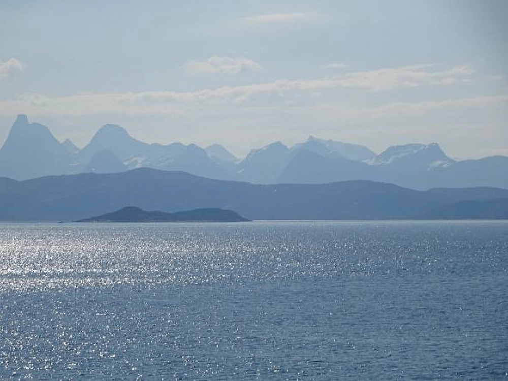 Mi sveglio durante la notte poco dopo le 3,00 e non riesco a riprendere sonno… poi per fortuna riesco ad addormentarmi. Al risveglio, dopo aver sistemato le borse, mi avvio verso il vicino porto da cui salpo con il traghetto delle 9,15. Traversata piacevole, con scorci sempre belli sulla costa delle Lofoten. Caffè sul ponte esterno della nave e foto con bandiera norvegese sventolante a poppa del traghetto. Si arriva a Bognes dopo un’ora di navigazione e imbocco nuovamente la E6 verso sud.