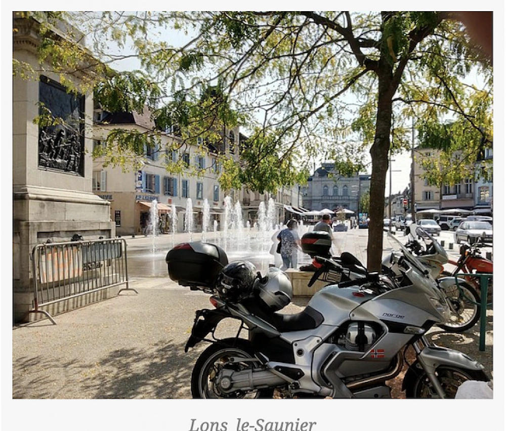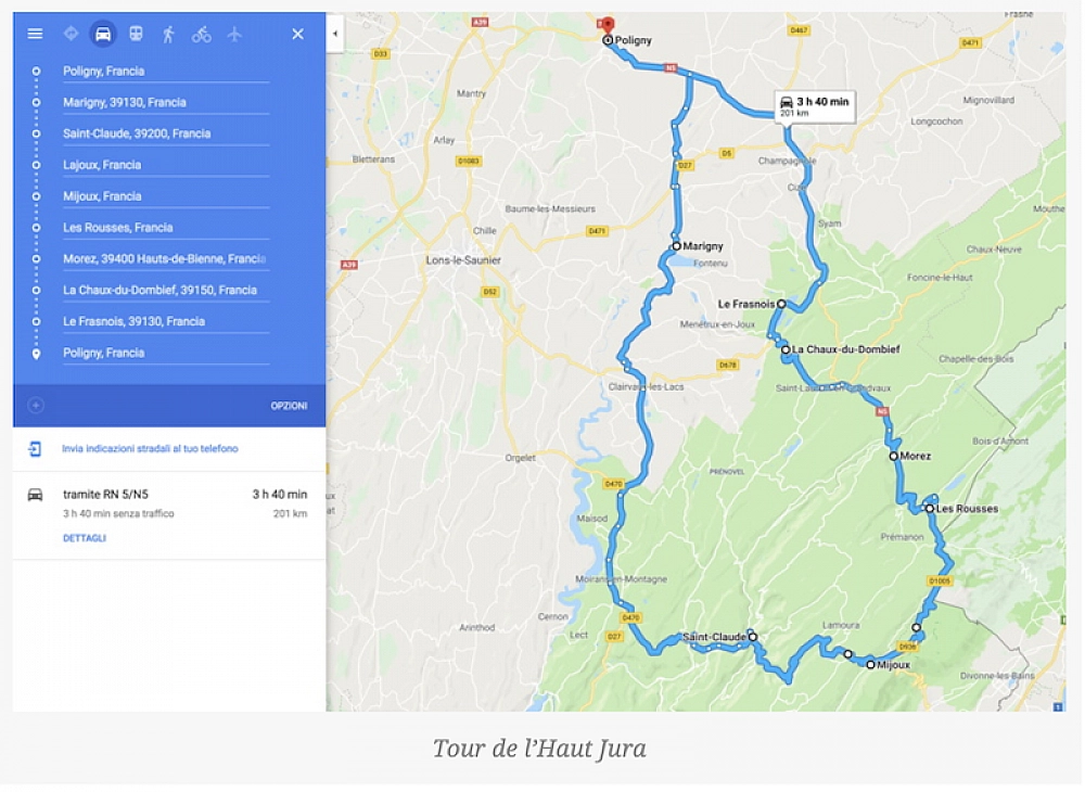 La trasferta di andata ha percorso un tragitto senza utilizzo di autostrada, passando in primis per il Passo del Gran San Bernardo, ed una volta superati Martigny e Montreux si è abbandonato il lungolago Lemano per attraversare gli abitati di Puidoux, ed Orbe (CH), per lasciare alfine la Svizzera e passare il confine, attraversando Jougne (F) per giungere a Poligny, centro della Regione francese del Jura e nostra “base”per qualche giorno.