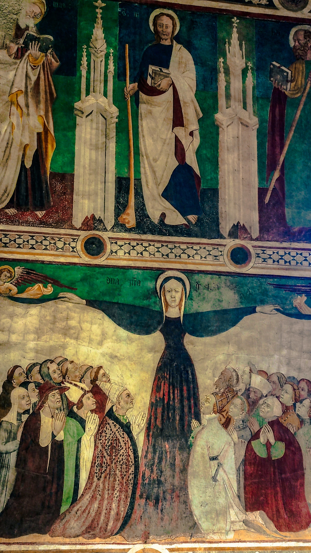 Le lunette del porticato rappresentano un’importante testimonianza storica poiché sono decorate con affreschi raffiguranti scene di vita quotidiana del Medio Evo, ricche di dettagli curiosi e interessanti che la guida ci ha aiutato a decifrare. Un’altra particolarità di questi affreschi è che mostrano tantissime incisioni di graffiti. Non si tratta assolutamente di atti vandalici, ma sono delle scritte in lingua francese, latina e italiana che sono state lasciate nel corso dei secoli da viaggiatori, visitatori e ospiti del castello. I graffiti sono presenti anche all’interno della struttura, ma sono particolarmente evidenti nelle lunette del porticato del cortile. La visita dell’interno del castello ci ha lasciati piacevolmente sorpresi grazie alla pregevole ricostruzione degli arredi e alle raffinate decorazioni delle stanze. L’ambiente che sicuramente ci ha affascinati maggiormente è la sala della giustizia dalle pareti sontuosamente affrescate ed un soffitto ligneo riccamente lavorato.