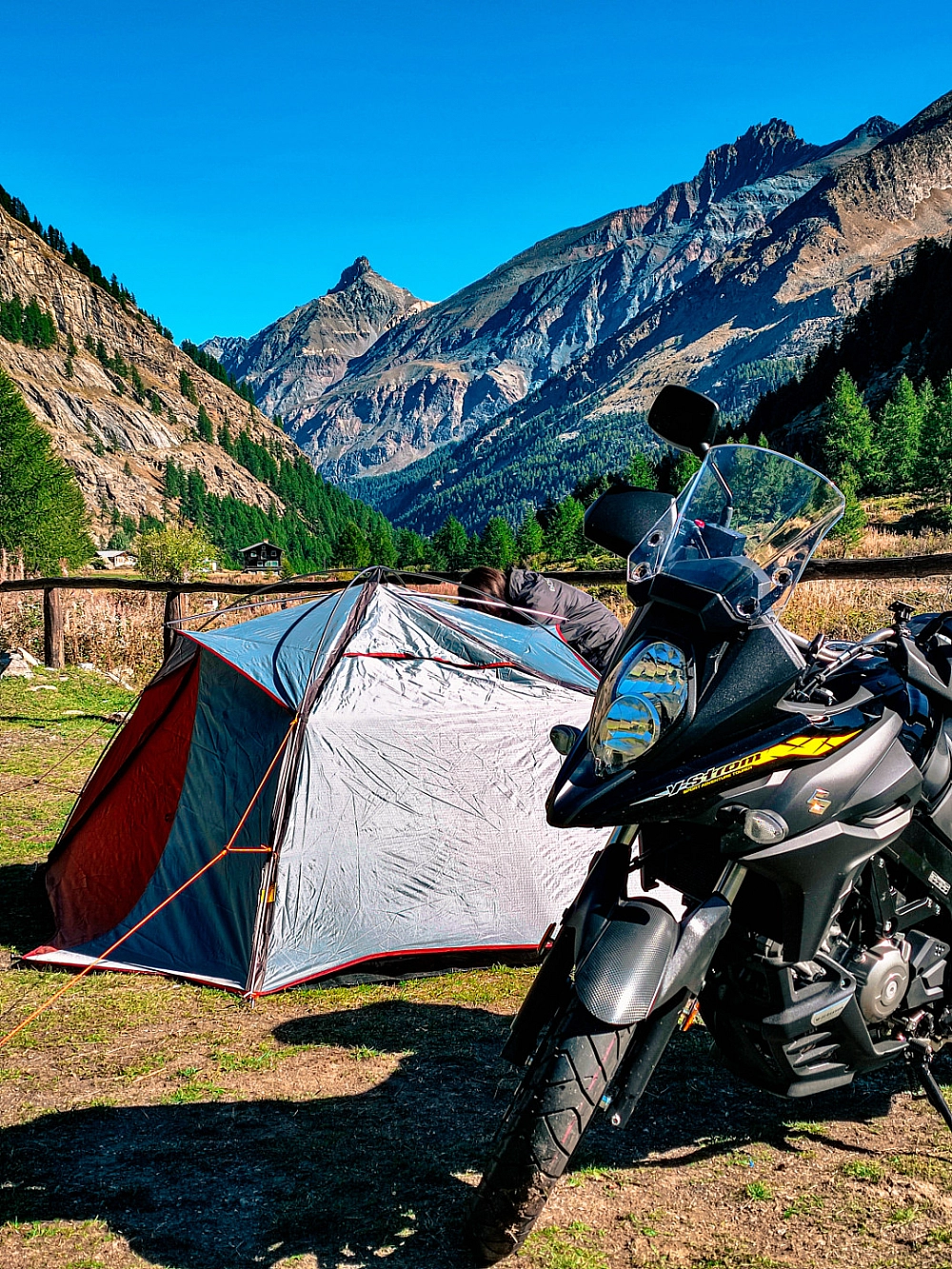 Al nostro risveglio abbiamo trovato la moto completamente gelata e la tenda ricoperta da un sottile strato di ghiaccio, segno che durante la notte la temperatura era scesa sotto lo zero. A scaldarci il cuore, più della deliziosa colazione con cappuccino e torta di mele, è stata la vista spettacolare delle montagne proprio di fronte alla nostra tenda. È impossibile descrivere a parole i sentimenti di felicità che abbiamo provato. Ci siamo sentiti veramente a contatto con la natura e circondati da una bellezza ineguagliabile. Dopo colazione abbiamo intrapreso un breve e facile percorso di trekking per gustarci fino in fondo l’esperienza di una vacanza in montagna. Al nostro ritorno abbiamo smontato la tenda e caricato la moto. Abbiamo lasciato il campeggio poco dopo mezzogiorno e ci siamo avviati verso la nostra seconda meta: il castello di Fénis. Abbiamo pranzato in una brasserie lungo la strada e abbiamo percorso a ritroso la SS26 fino ad arrivare alla nostra destinazione. Lungo il percorso ci siamo imbattuti in nuovi castelli che visiteremo nel nostro prossimo viaggio in Valle d’Aosta: il castello di Saint Pierre e il castello reale di Sarre.