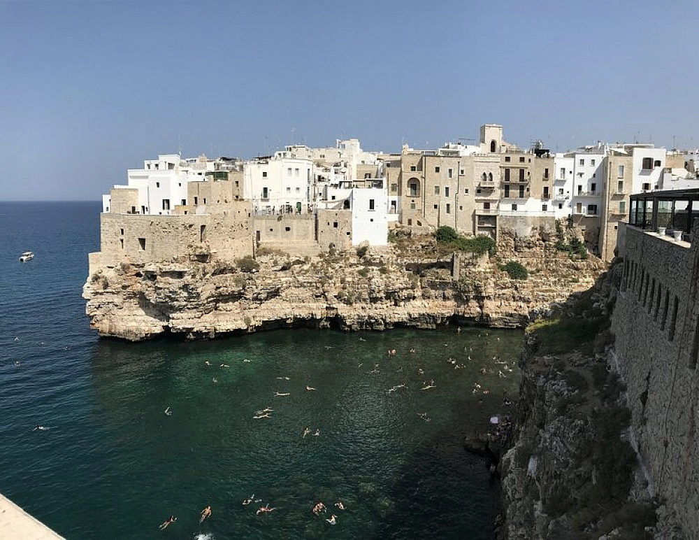 Dopo più di tre ore nella fornace del Tavoliere (già a punto di cottura di prima mattina), attraversate anche le saline punteggiate dai fenicotteri, finalmente arriviamo a Polignano a Mare. Ne è valsa davvero la pena: la piccola città offre scorci incantevoli ad ogni angolo, come una femmina mediterranea, bella e disinvolta, in posa per il pittore.