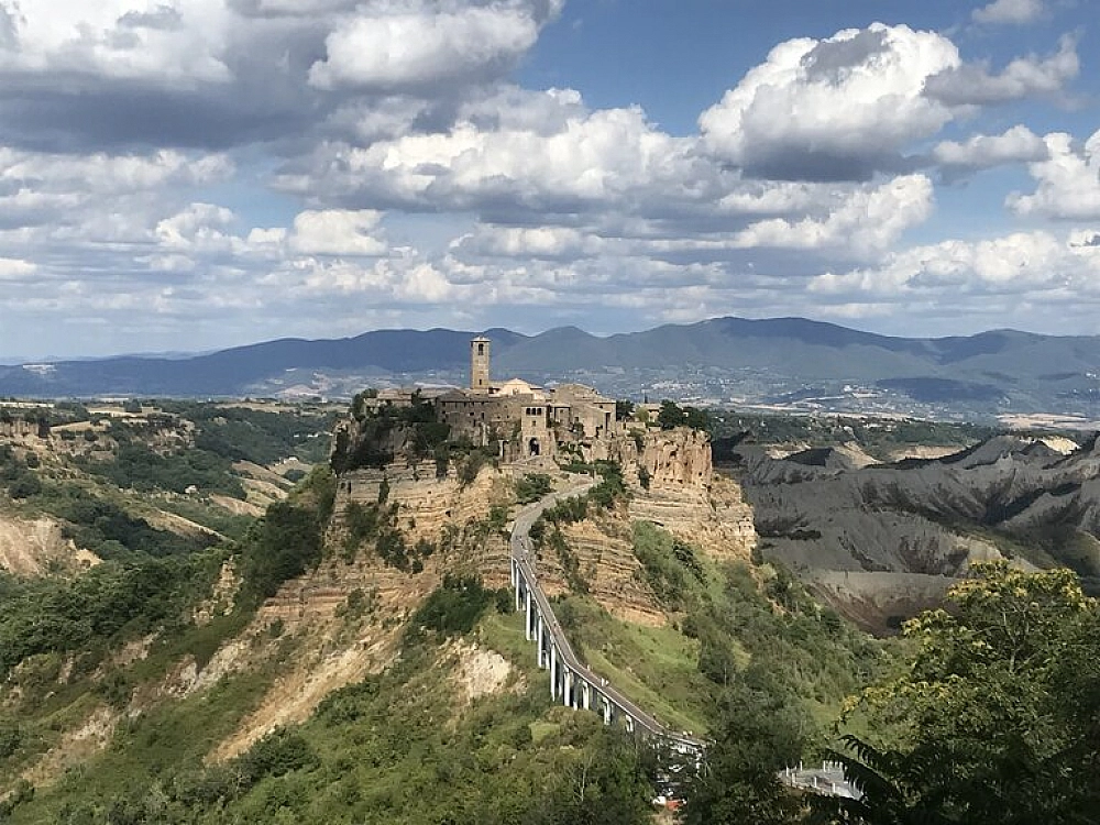 Nel cuore della Tuscia, tra pascoli di pecore, mucche e cavalli, attraverso campi dorati, come pani dolci fragranti, su cui le balle di fieno sparse sembrano granella di zucchero leggero. Il cielo, di un azzurro intenso, è reso ancora più sconfinato dalle nuvole bianche e spumose come meringhe. I paesini che si susseguono sui colli sono così perfetti nei tratti, da sembrare quadri dipinti su un fondale.