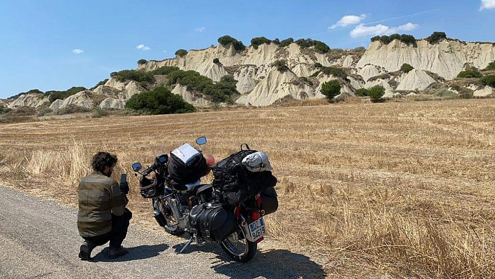 Una bomba d’acqua notturna non scalfisce il nostro riposo fatato in un trullo che è magico in ogni pietra che lo compone: ma le favole terminano spesso con un risveglio, e c’è tanto tanto tanto e tanto ancora da assaporare. Mar Piccolo e Mar Grande: Taranto! Ma è la nostra porta d’uscita dalla Puglia, la Lucania ancestrale ci aspetta imminente. Lungo il litorale Ionio riscopriamo le Tavole Palatine e le memorie di Pitagora. Mare, mare ed ancora mare prima di infilarci verso l’interno selvaggio. Craco deserta, ma vivissima d’umanità; Craco che non ha retto la modernità, ma piace pensare che l’abbia rifiutata (semi cit.). Di qui l’itinerario prende una dimensione se possibile ancor più irreale: Alianello ed i Calanchi, un incedere solitario in un misto fra un deserto vero e proprio ed un set alla Sergio Leone. Con noi, solo il vento. Cristo si sarà fermato pure ad Eboli ma noi puntiamo Aliano Leviana, prima di toccare anche la Calabria (punto più a sud del viaggio) e riprendere verso il Potentino. Picerno, emozioni, Lagopesole e Venosa. “D’altra parte perché sacrificarsi per i posteri, che cosa hanno fatto questi posteri per noi? Allora dico insieme al poeta Orazio Quam minimum credula postero»; e la Venosa oraziana accoglierà stanotte la Strana Coppia sulla Strana Moto. L’Aglianico generoso corrobora sogni e riposi.