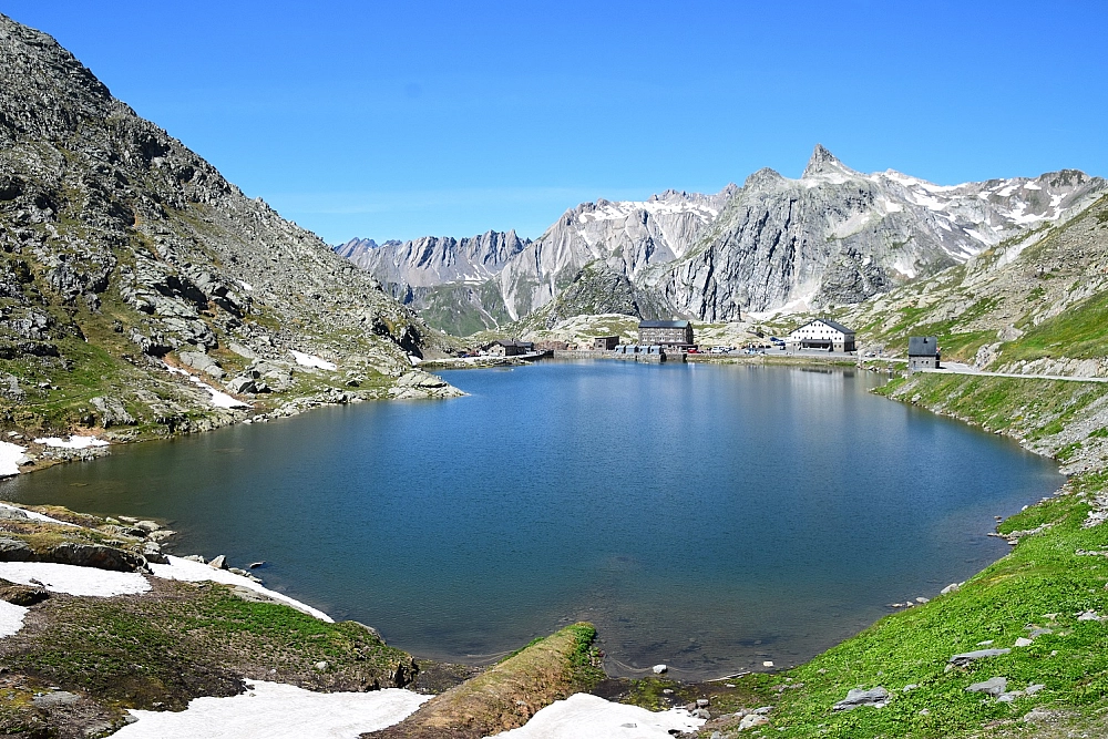 Non possiamo farci mancare il Gran San Bernardo, percorrendo la statale sulla quale si correva la Aosta-San Bernardo e dove sono state girate alcune scene del celebre film “Un maggiolino tutto matto”. La strada si srotola tra strapiombi mozzafiato e punti panoramici incredibili fino ad arrivare al lago di Saint Rhèmy en Bosses dove ci fermiamo per le foto di rito al cartello del “Col du Gd-St-Bernard” e alla vecchia dogana. L’aria è fresca, il cielo è limpidissimo ed il sole è accecante, ci troviamo a 2473 metri, c’è ancora un po’ di neve, ci fermiamo sulle panche vicino al lago a mangiarci i panini con la fontina di alpeggio che abbiamo acquistato lungo la strada.