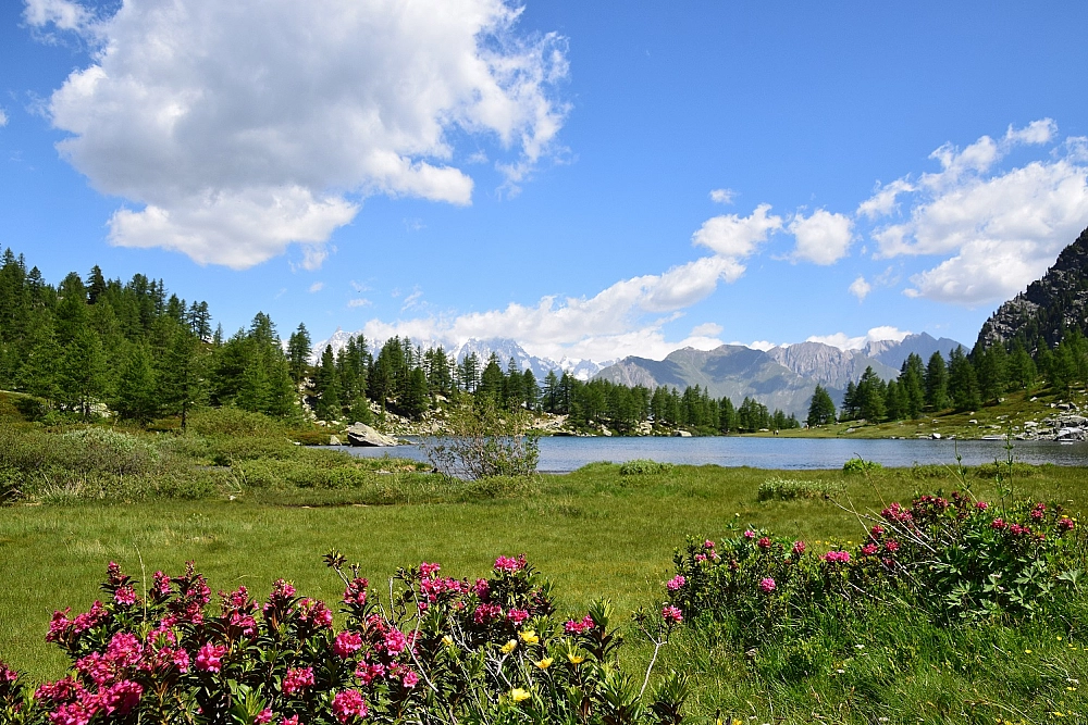 L’adrenalina non manca ma un po’ di relax ci vuole: a metà strada c’è il Lago d’Arpy, dalle foto viste sul web sembrerebbe bellissimo. Decidiamo di andare e vederlo. Posteggiamo le moto nell’ampio parcheggio dell’Hotel Genzianella, ci cambiamo e diventiamo escursionisti. La camminata di un’ora circa è facile, leggermente in salita e con un dislivello non eccessivo. Arriviamo a 2066 metri, costeggiamo il sentiero che gira attorno al lago fermandoci in più punti per fotografare il Massiccio del Monte Bianco che si specchia nelle acque calme e ghiacciate del lago, regalandoci scatti da cartolina. Torniamo al parcheggio e ci incamminiamo sul sentiero situato sul retro dell’Hotel Genzianella che, attraverso il bosco, ci conduce al “Balcone” con vista spettacolare sul massiccio del Monte Bianco.