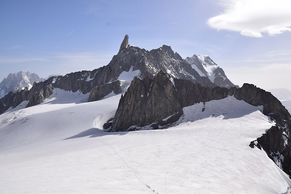 Essere in Valle d’Aosta e non recarsi sul Monte Bianco è impensabile. Lo Skyway è l’impianto di risalita che permette di raggiungere il punto più vicino alla vetta del Monte Bianco, partendo dai 1300 metri di Courmayeur per arrivare ai 3466 metri di Punta Helbronner. Posteggiamo le moto nel grande parcheggio adiacente la biglietteria e saliamo. Decidiamo di andare subito alla terza stazione Punta Helbronner, scendiamo dalla cabinovia e ci sembra già di toccare il cielo con un dito. All’Osservatorio 360° il rumore del vento sferzante e gelido ci avvolge completamente, siamo in una cornice senza confini dove cielo e roccia si uniscono in uno sfondo unico e surreale. Non smetteresti più di scattare foto, vorremmo rimanere ancora ad ammirare questo spettacolo ma non siamo vestiti abbastanza, ci sono 4 gradi, dobbiamo rientrare nel padiglione a scaldarci un po’. Prendiamo un caffè seduti comodamente al “tavolo dell’infinito” presso il Kartell Bistrot Panoramic dove pareti e pavimento trasparenti ci contornano, sembra di essere sospesi nel vuoto. Proseguiamo la visita allo SkyVertigo, anche lì tutto è trasparente, sei a pochi metri dalla montagna e ti sembra di camminare sospeso nell’aria. Proseguiamo la visita alla “Sala dei Cristalli” con teche piene di enormi quarzi e cristalli di cui il gigante delle Alpi ne è il proprietario. Il nostro biglietto prevede una sosta massima di un’ora e mezza a punta Helbronner per cui scendiamo alla seconda stazione il Pavillon a 2173 metri. Qui la temperatura è decisamente migliore, gironzoliamo nel giardino botanico alpino che contiene più di 900 specie botaniche fermandoci in diversi punti per scattare foto meravigliose non solo ai fiori e al paesaggio, ma anche alle simpatiche marmotte che fanno capolino tra le rocce.