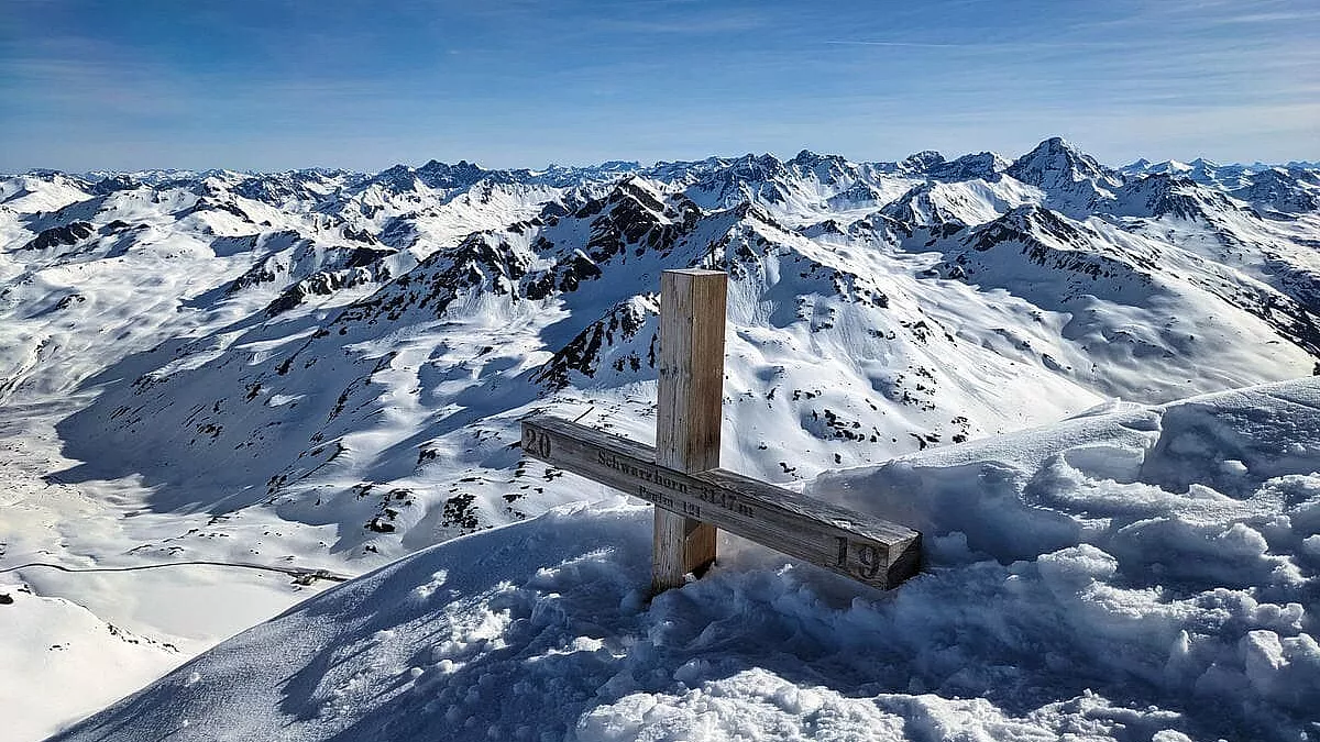 Ai lati, invece, dovreste vedere lo spettacolo di altre due vette imponenenti: il Piz Murtera (a destra) e il Piz Ras (a sinistra). Dopo circa 15 chilometri, arriviamo in prossimità di quella che, a nostro avviso, è la cima più bella di tutto il percorso in moto, ossia lo Schwarzhorn (con tanto di croce in vetta).